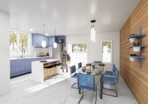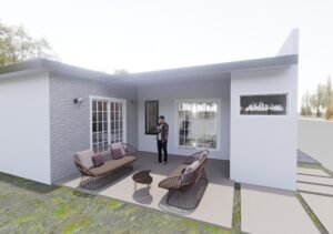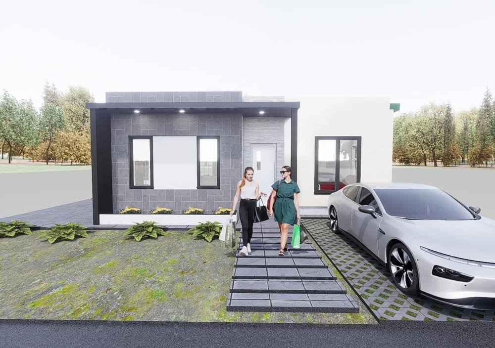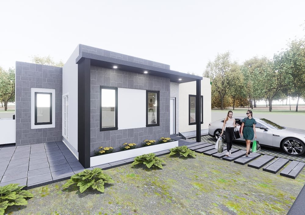 Fachada moderna con detalles en piedra.